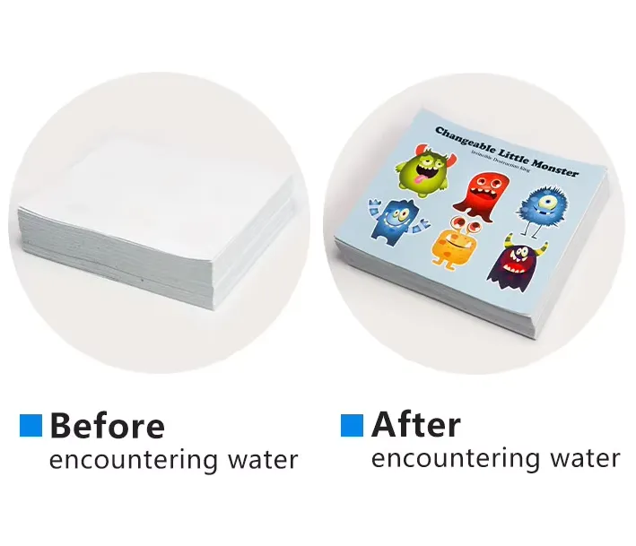 Anda dapat merendam label sensitif terhadap air yang berubah warna ke dalam air selama 3 detik akan membengkak dan menyebar sepenuhnya, dan efek perubahan warna sangat jelas.
