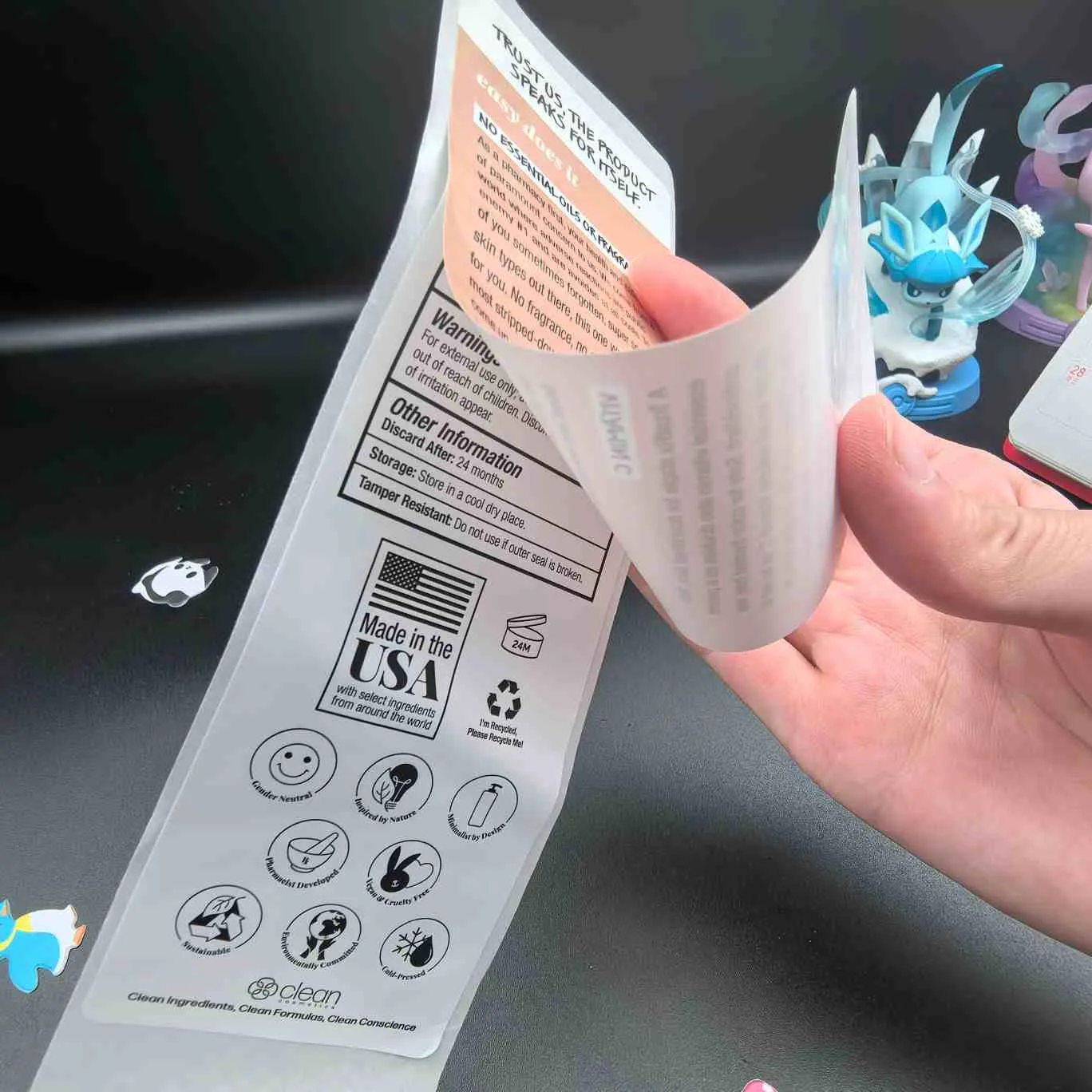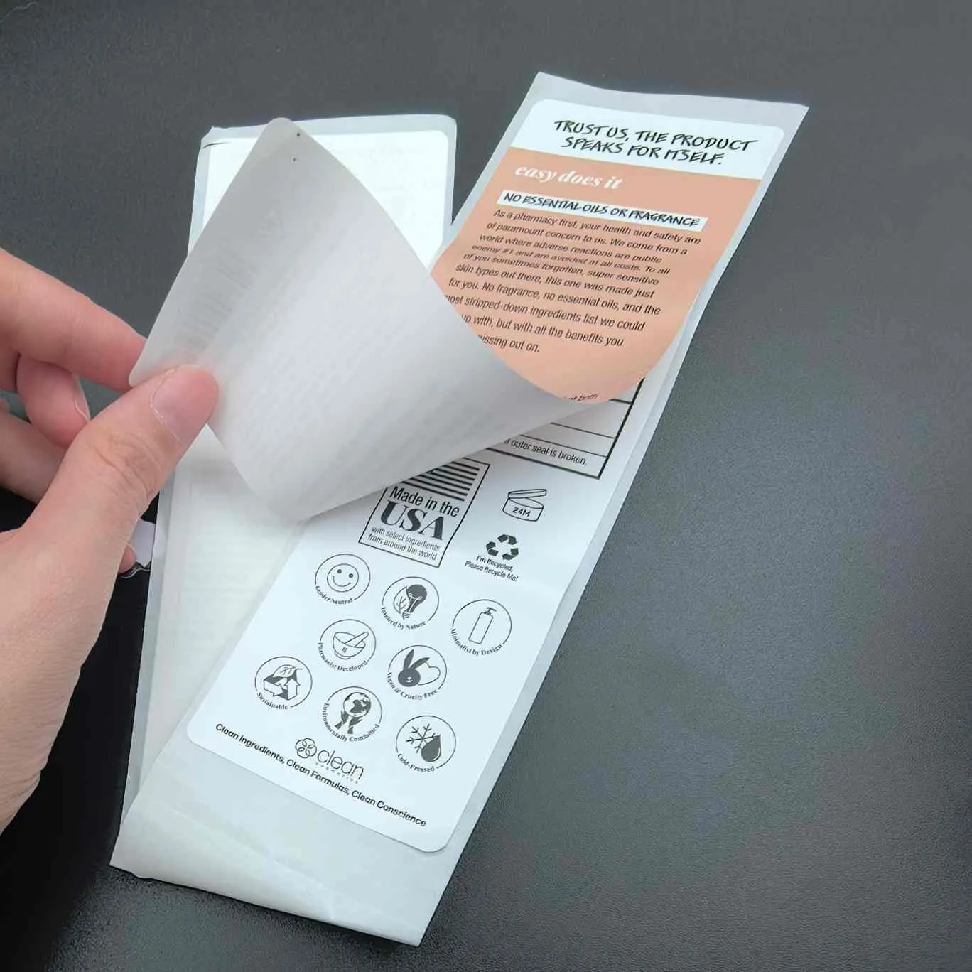 Kupas dan baca label:Tipe paling dasar, Disebut juga multiLayer untuk label kosmetik. Lapisan atas mudah terkelupas, dan lapisan dalam berisi informasi tambahan. Sering digunakan untuk masker wajah, serum, dan produk kemasan kecil lainnya.