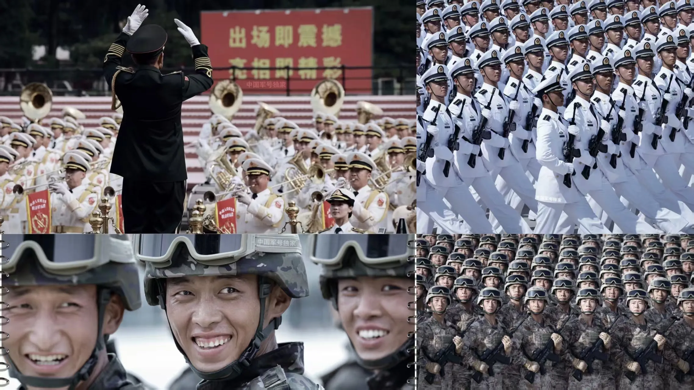 Di Tiananmen Square, 45 formasi dan eselon lulus secara berurutan, dan sebuah band militer bersama yang terdiri dari lebih dari seribu perwira dan tentara memainkan suara -suara kuat dari zaman itu.