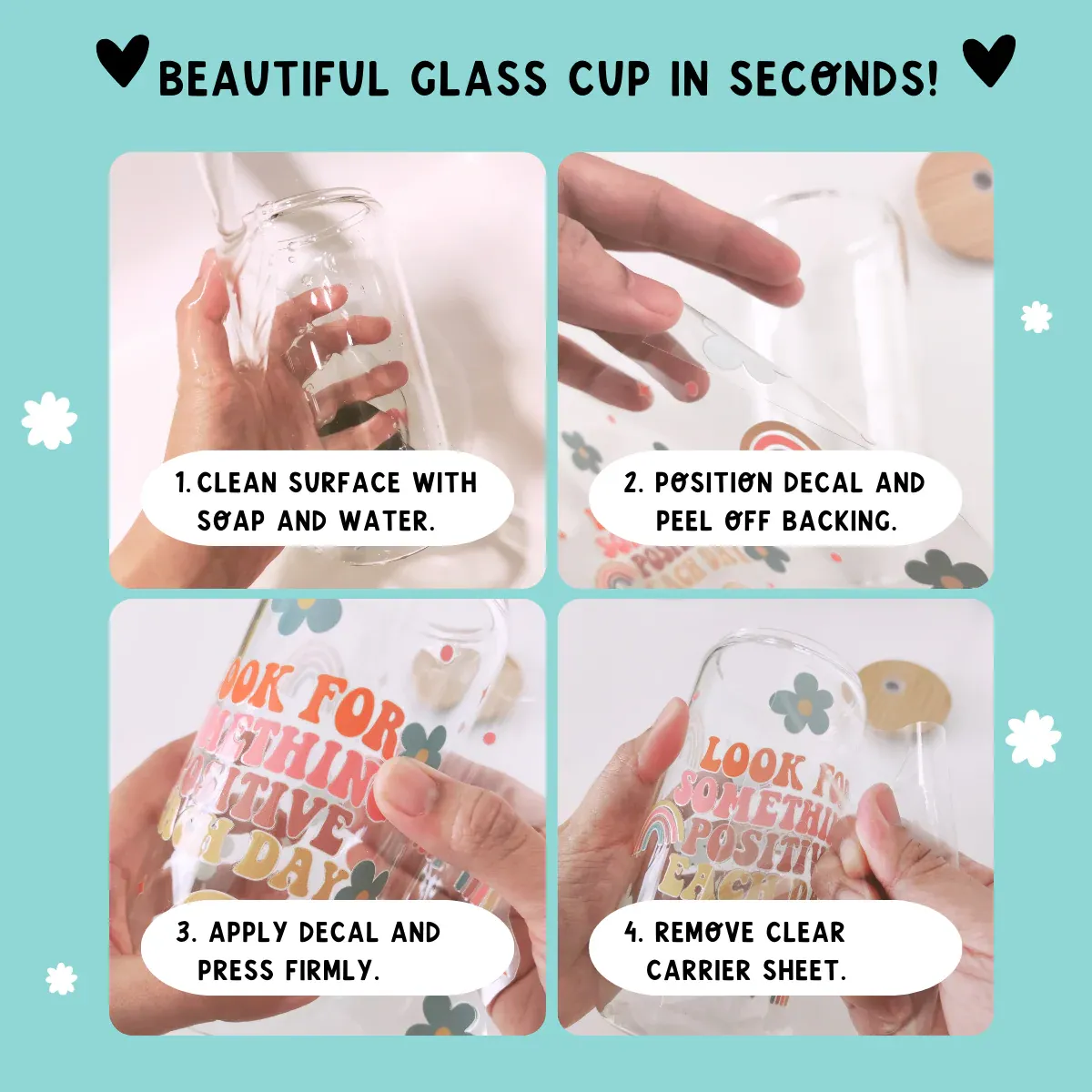 1. Pastikan permukaan gelas kaca 16oz bersih, kering, dan bebas minyak, lap perlahan dengan bantalan alkohol atau kain tidak berbulu untuk menghilangkan debu, noda air, atau minyak.