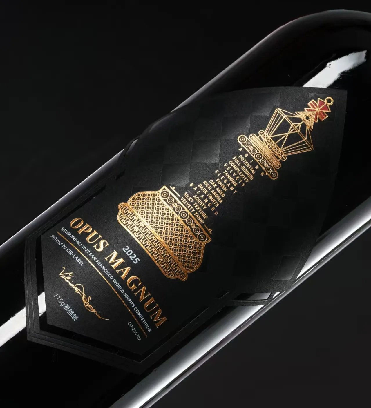 Inilabel anggurmenampilkan stempel foil emas yang luas. Latar belakang hitam dipadukan dengan pola garis emas, sedangkan teks menggunakan kombinasi emas dan putih. Kecerahan emas dan kilauan stempel foil, serta pola dan teks yang sedikit terangkat, menciptakan penekanan dan lapisan yang jelas, memberikan estetika klasik dan elegan.